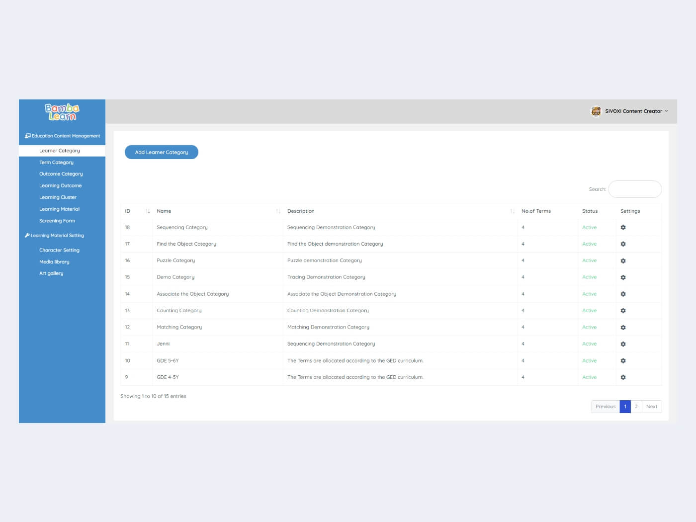 The admin can search, add, view, update, and manage the term category along with the category details such as ID, term name, learner category, Planned Learning Clusters, Allocated Learning Clusters, No of Learning Outcomes, No of Screening Form, No of Learning Material, activation status, and more. The admin can sort the term details based on the learner category.