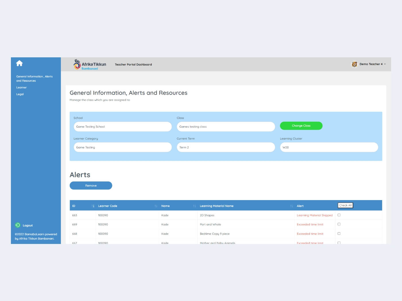 The teacher can view the dashboard with the details such as the school, class, learner category, current term, learning cluster, and more. The teacher can get and view the list of alerts along with the details such as ID, learner code, name, learning material name, alerts, and more. The teacher can remove the alerts. The teacher can change their class as well.
