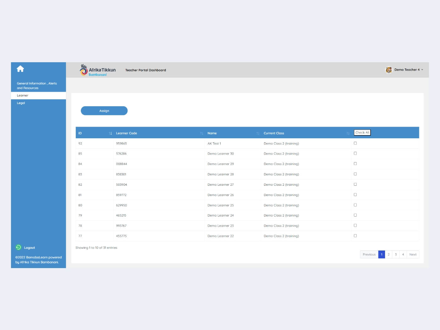 The teachers can view the list of learners along with the details such as ID, learner code, name, learner progress, screening form, activation status, and more.